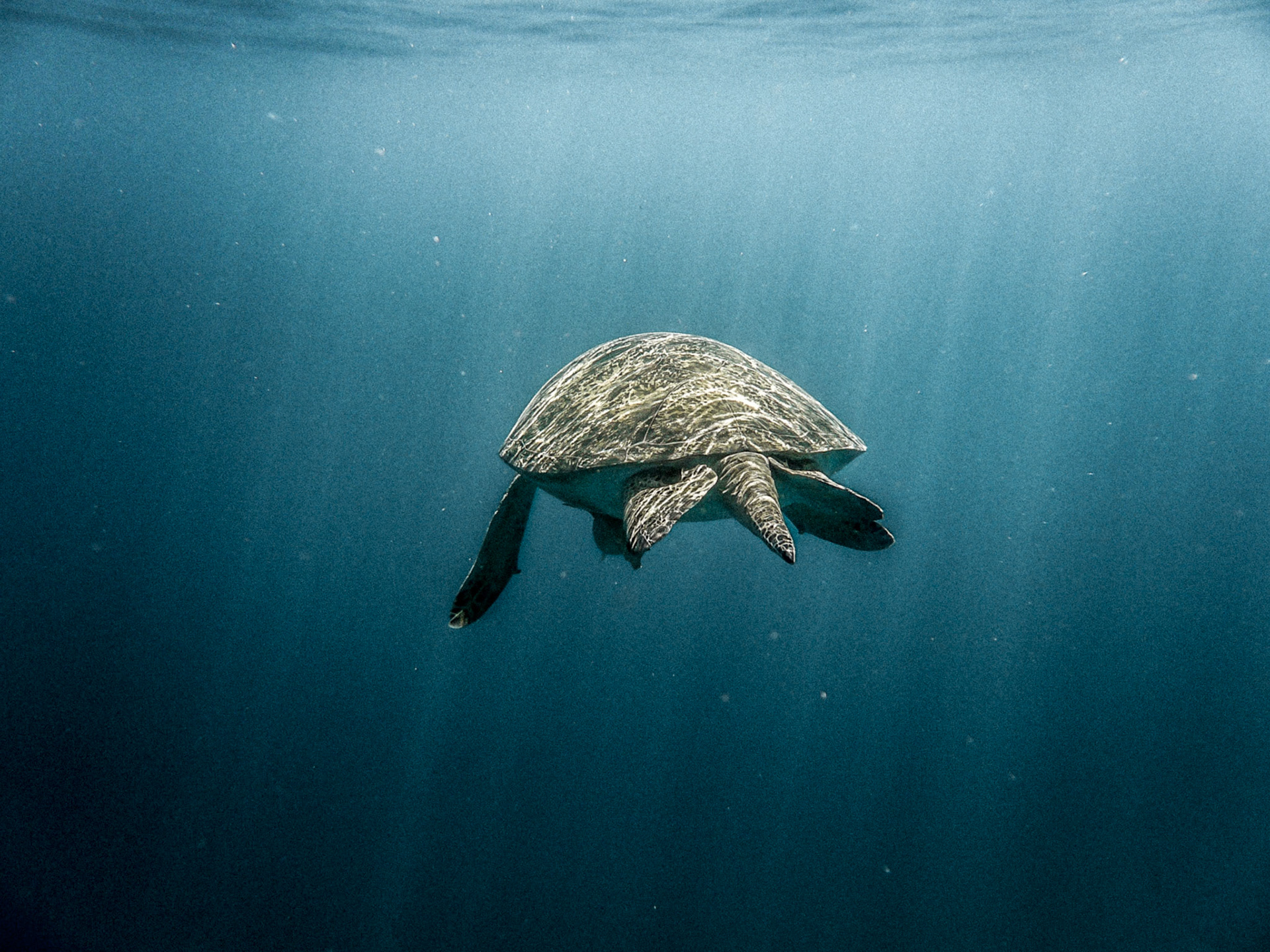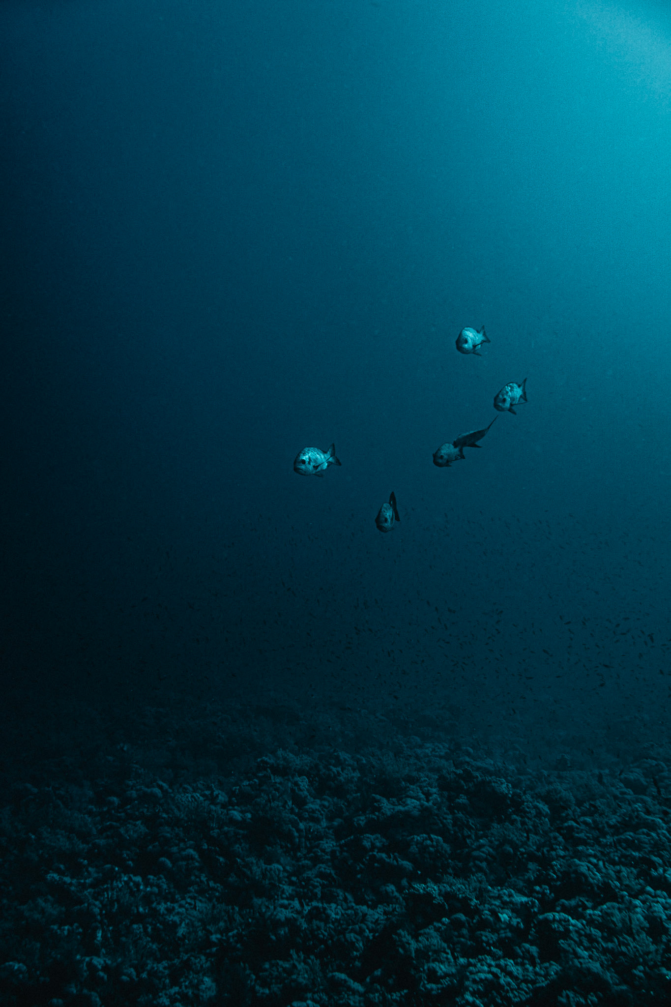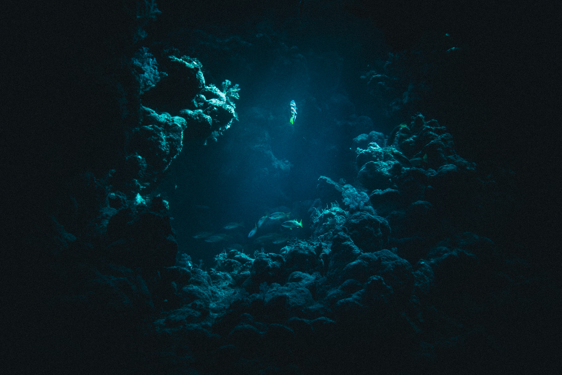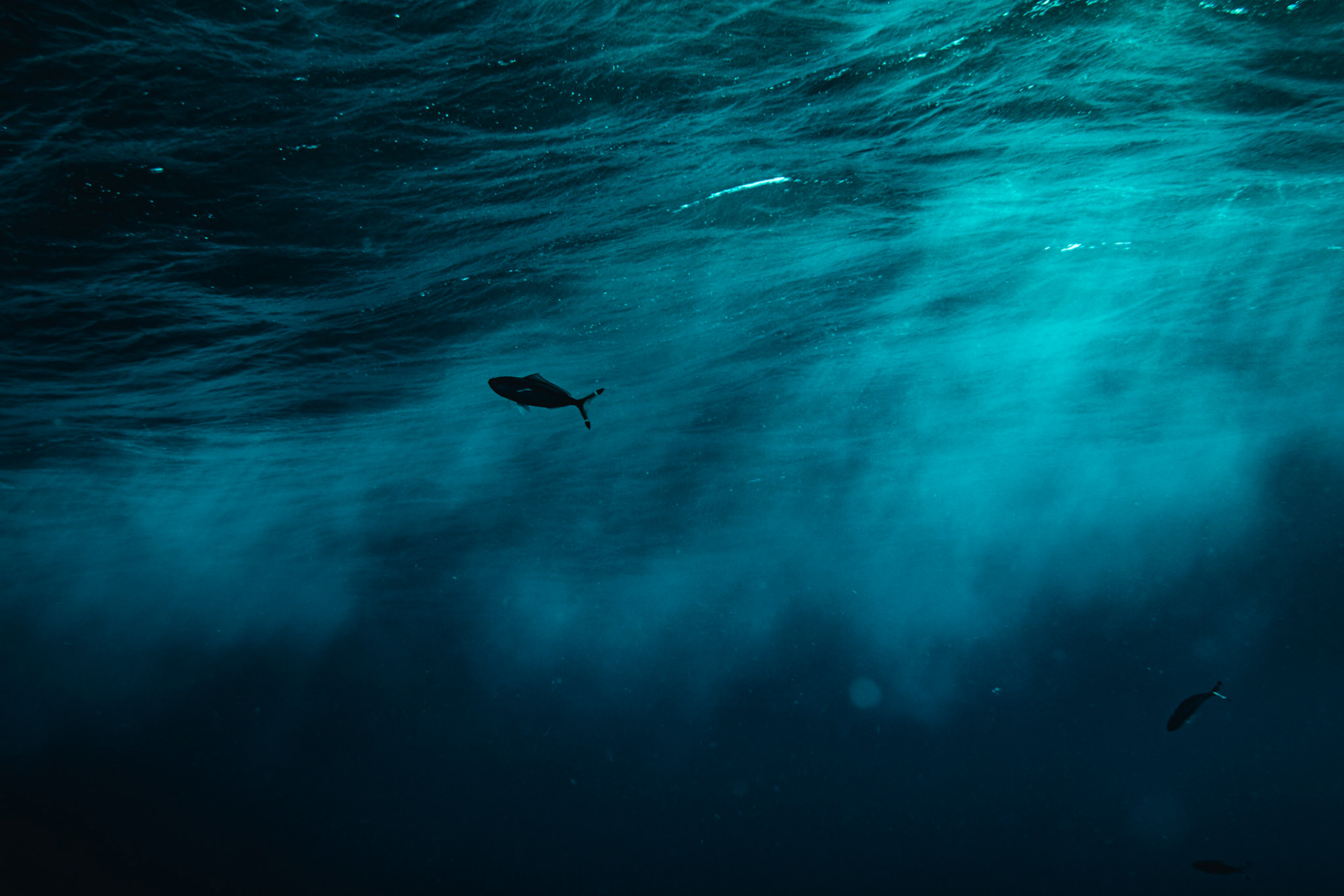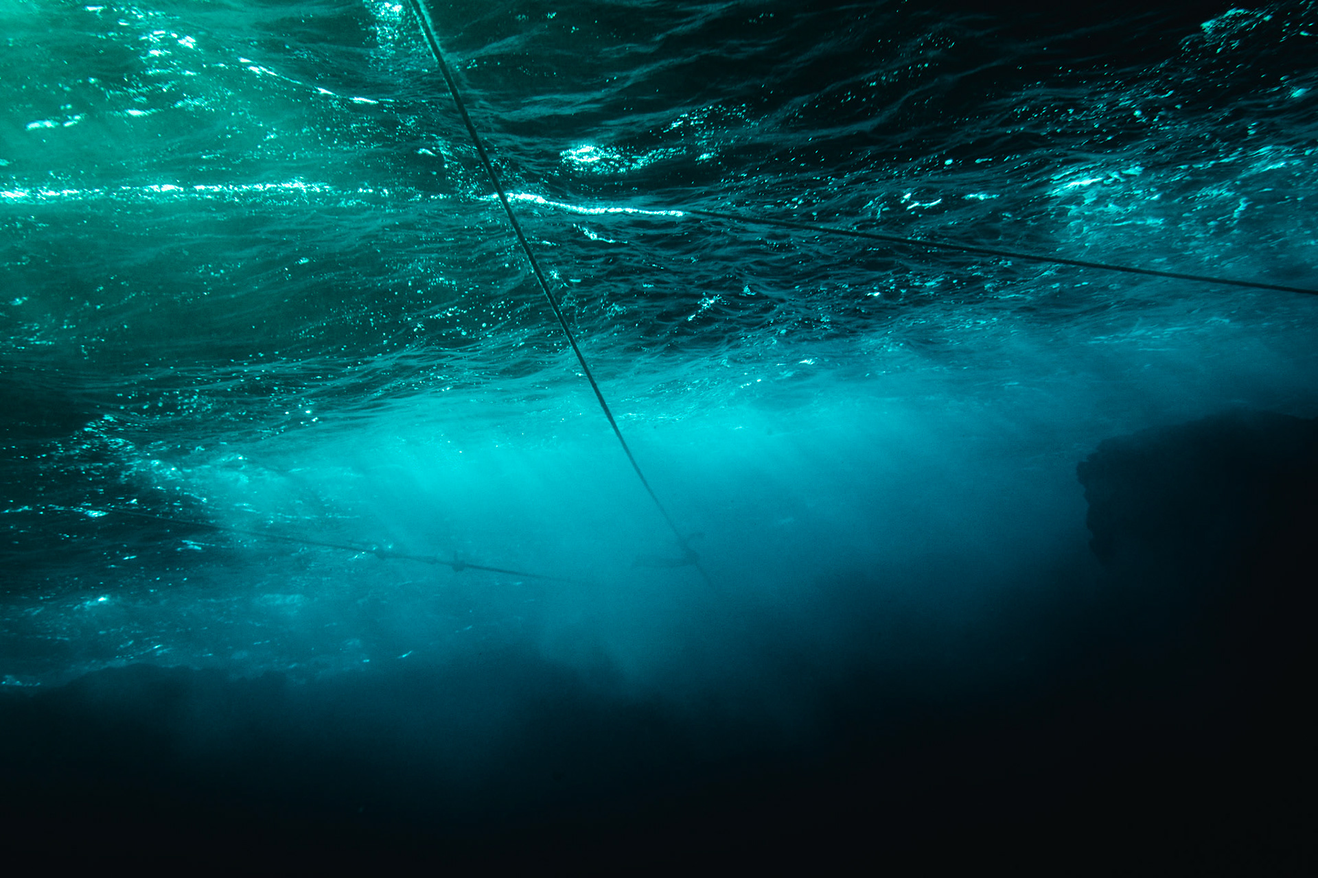 Sunken wreck from the bottom of the sea. About 20 meters in the deep. In the middle the mast directing upwards to the light surrounded by many small fishes.